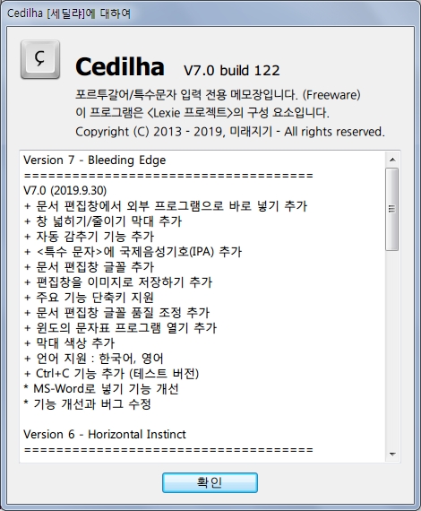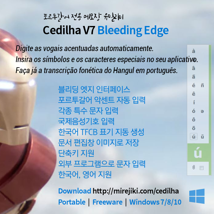 Cedilha (세딜랴)는 포르투갈어 악센트 입력 전용 메모장으로 특수문자를 빠르게 입력하는 데 도움을 주는 유틸리티입니다. 버전 7 (코드명 "블리딩 엣지")에서도 아이언맨의 나노입자 슈트처럼 놀라운 여러 가지 기능이 추가되고 개선되었습니다.