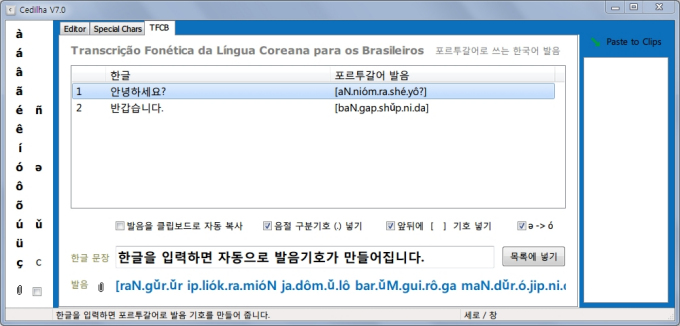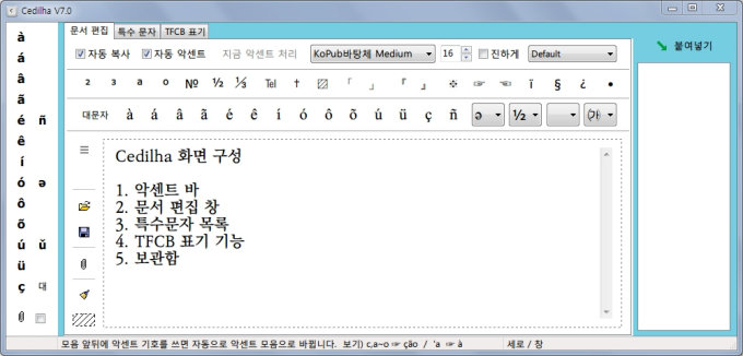 외부 프로그램으로 문자를 넣는 기능을 개선했습니다. 보관함의 내용을 문서 편집창으로 바로 넣는 기능도 추가되었습니다. 이번 버전에는 <Ctrl+C로 악센트 넣기> 시험 기능이 슬쩍 장착되어 있습니다. 외부 프로그램에서 모음과 강세부호를 선택하고 Ctrl+C를 누르면 자동으로 강세모음 부호로 바꾸어 줍니다. 이 기능은 아직 테스트 중입니다.
